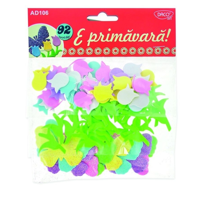 Setul contine 92 bucati de forme din spuma autoadeziva, model lalele, frunze fluturi. Dimensiuni variate.