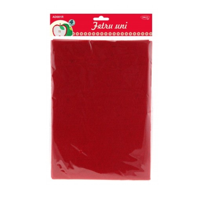 Accesorii ideale pentru decoratiuni si proiecte de lucru manual. Contine 4 buc. Culoare rosu, material din fetru, de dimensiune A4.