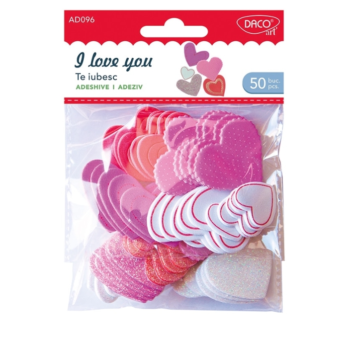 Setul contine 50 de bucati inimi printate sau glitter din spuma autoadeziva. Culoare alb, rosu, roz, fucsia. Dimensiuni variate