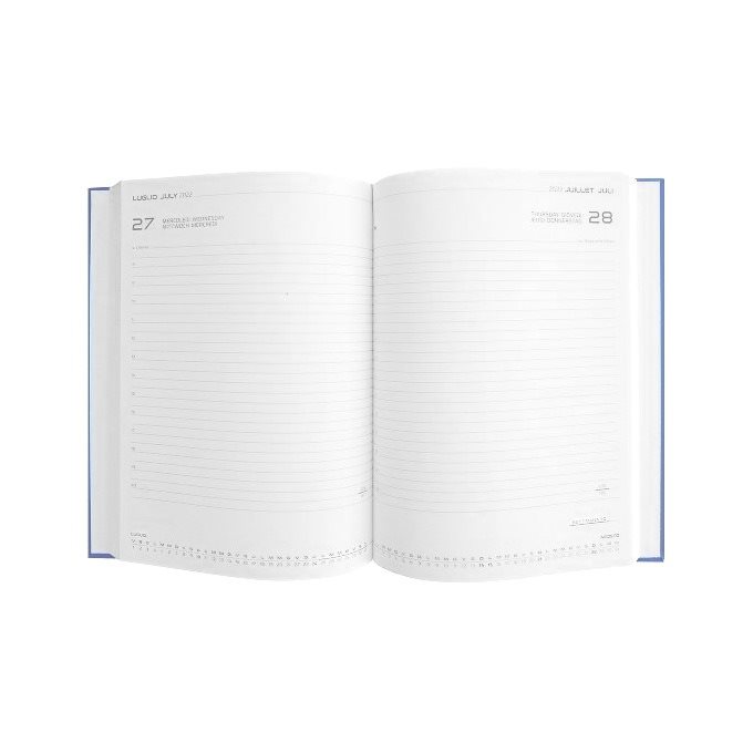 Agenda A5 datata, coperta culoare albastra, cu 224 pagini, din hartie de culoare alba, cu un gramaj de 60 g/mp.
