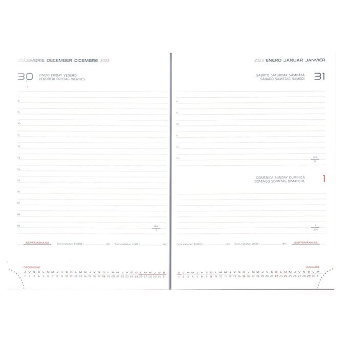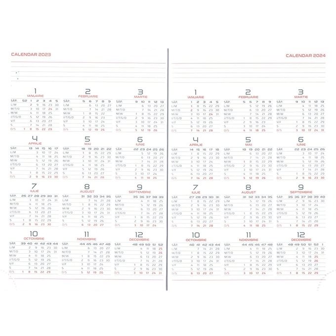 Agenda A5 datata, coperta culoare rosie, cu 224 pagini, din hartie de culoare alba, cu un gramaj de 60 g/mp.