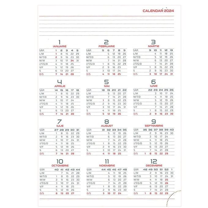 Pentru fiecare zi lucratoare este dedicata o pagina (zilele de sambata si duminica sunt impreuna pe o singura pagina)