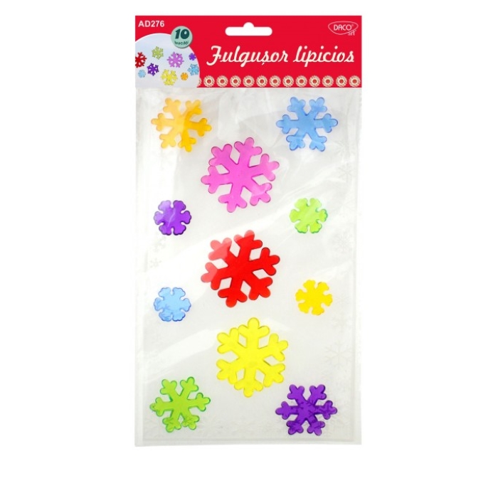 Fulgusor lipicios contine 1 coala, cu 10 de fulgi multicolori de dimensiuni variate autoadezivi pentru decoratiuni.