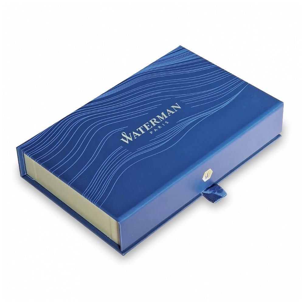 Accesoriile placate cu crom. Clip din otel inoxidabil tip arc placat cu crom. Capac din otel inoxidabil lacuit cu multiple staturi de lac albastru pastel mat. Capacul se inchide prin apasare. Corp din otel inoxidabil lacuit cu multiple staturi de lac. Grip din ABS (acrylonitrile butadiene styrene) de culoare neagra.Mina roller Waterman